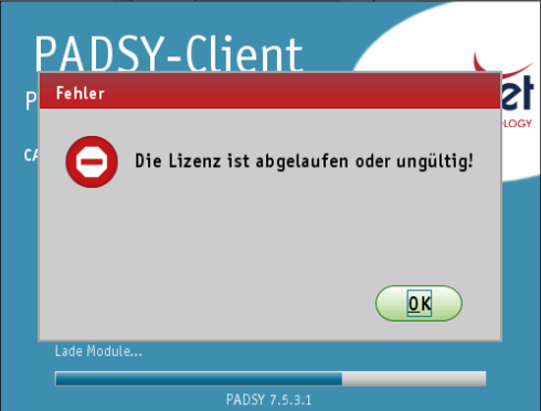 Bei der Fehlermeldung "Lizenz abgelaufen oder ungültig", kann der PadsyServer keine Daten im Netzwerk an den PadsyClient senden.